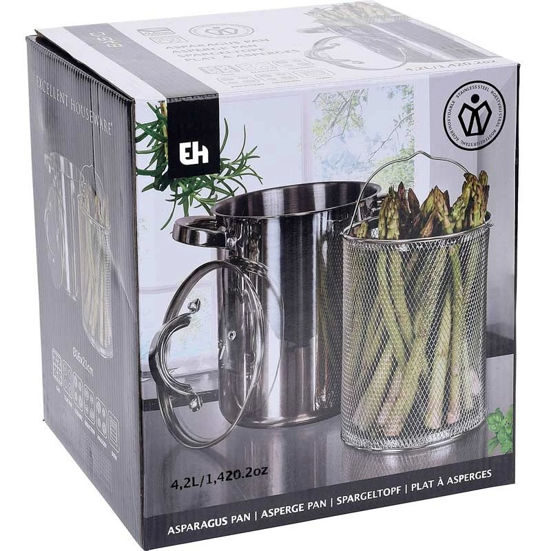 - Speciaal ontwerp: De pan is voorzien van een inzetmandje met handvat, waardoor het gemakkelijk is om de asperges uit de pan te halen zonder dat ze breken of buigen. Het mandje is zo ontworpen dat de asperges rechtop staan tijdens het koken, wat zorgt voor een gelijkmatige bereiding.