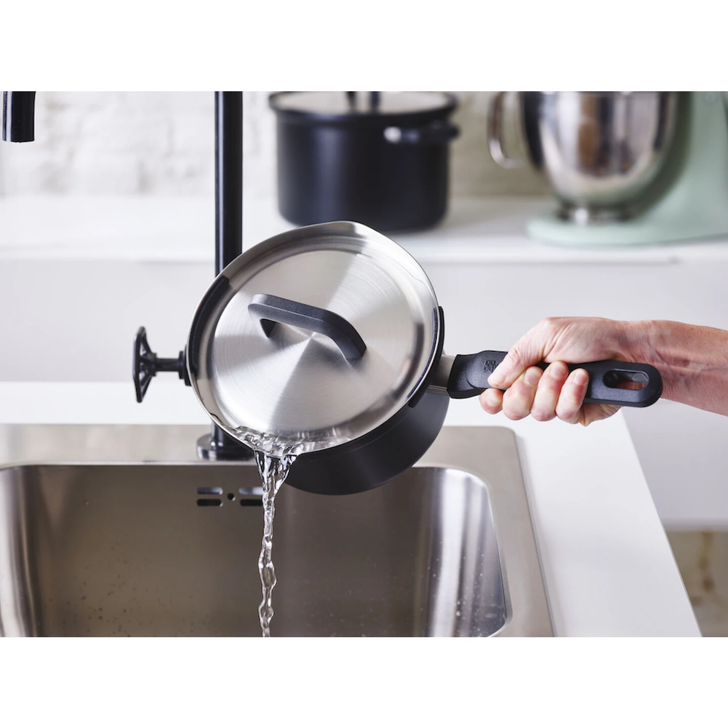 Een stoere zwarte rvs pannenset van BK. De BK Flow Cool Black RVS pannenset is vier delig en bestaat uit 3 kookpannen met deksel en een steelpan met deksel. De BK Flow Cool Black kookpannen zijn voorzien van een veilig en uniek afgietsysteem. Met een simpele kwartslag draai, vergrendeld de deksel onder de zwarte siliconen stoppers. Zo kun je op een veilige manier met twee handen afgieten.Â