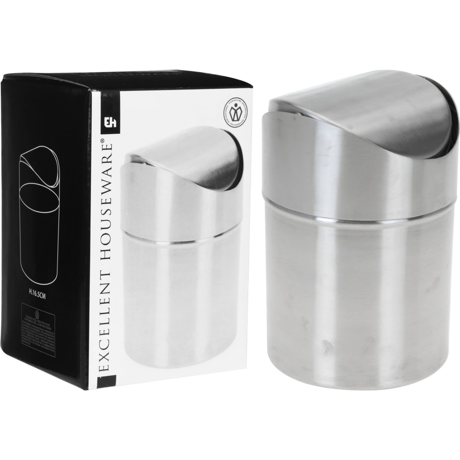 Voor allerlei kleine prullen, zoals snoepwikkels, bonnetjes en plukken haar heb jij deze tafelafvalbak van Excellent Houseware! Deze ronde afvalbak is gemaakt van RVS, heeft een diameter van 12,5 cm en is bijna 20 cm hoog. Door het handige swingdeksel is dit prullenbakje ontzettend makkelijk in gebruik, en met een inhoud van 1,5 liter is hij perfect voor op tafel of op het aanrecht!