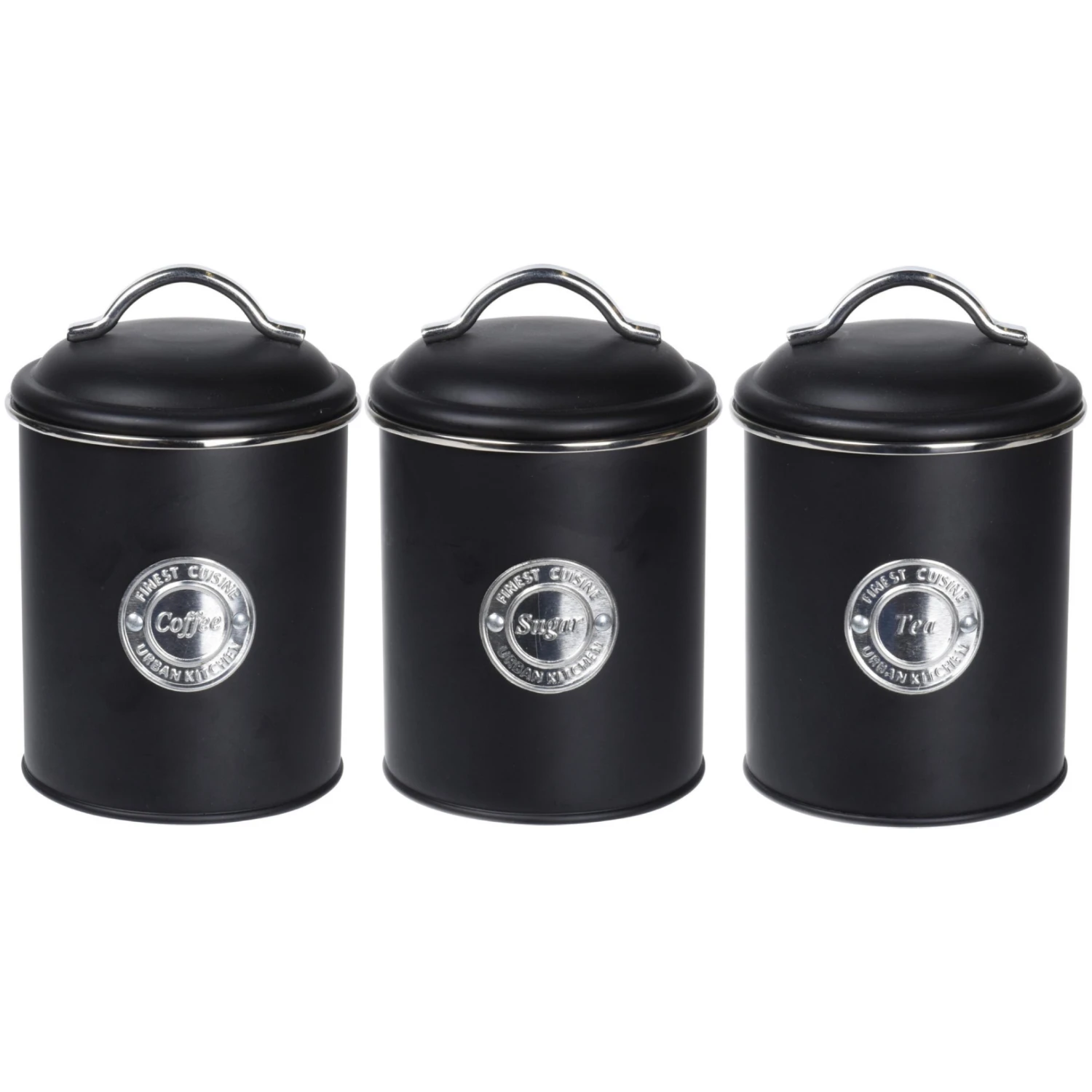 Bewaar je koffie, thee en suiker in deze stoere Excellent Houseware voorraadblikkenset 3-delig. De mat zwarte blikken zijn voorzien van een deksel en hebben aan de voorzijde de tekst; coffee, tea, sugar.