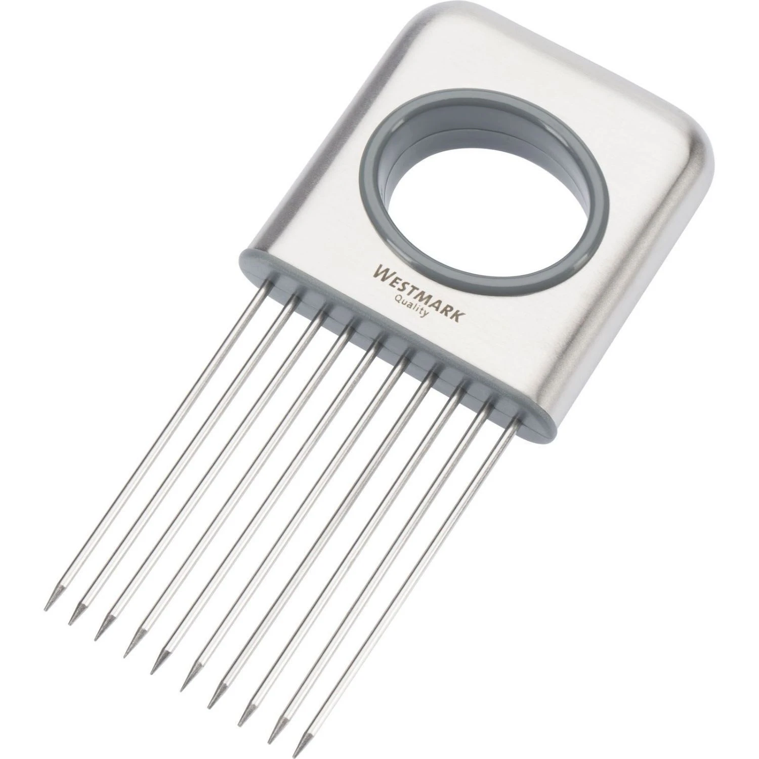 Deze handige uienkam voedselhouder dient als snijhulp voor het gelijkmatig snijden en hakken van vlees, braadstukken en worsten, maar ook groenten en fruit. Met zijn hulp kun je gemakkelijk fijne en gelijkmatig dikke plakken maken – de perfecte hulp voor een geslaagde maaltijd.